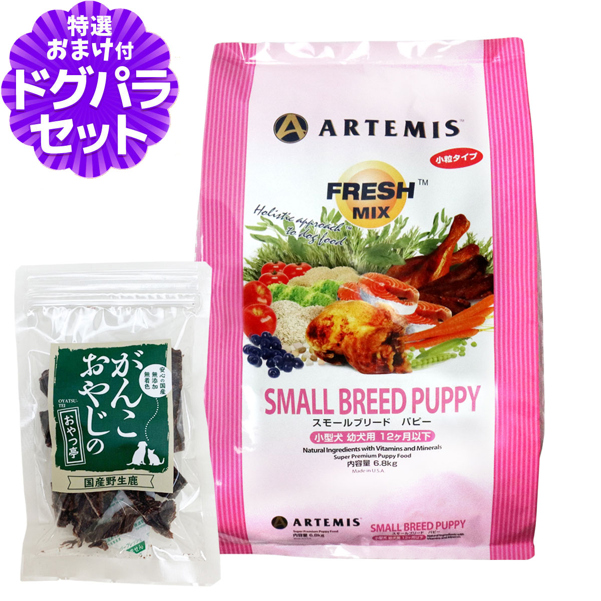 アーテミス フレッシュミックス スモールブリード パピー 6.8kg+国産鹿肉ジャーキー20gアーテミス フレッシュミックスの解説アーテミスは世界25か国以上で愛犬家たちに愛されているアメリカ生まれの最高品質プレミアムドッグフード。時間と手間をかけて行なう独自の加工方法で新鮮さにこだわり、素材が持つ栄養とおいしさを最大限に活かしました。フレッシュミックス スモールブリードパピーの詳細対象小型犬・幼犬用、離乳期〜12ヶ月以下スモールブリードパピーについて・育ち盛りの仔犬やその母犬の為、良質なタンパク質・脂肪分が含まれています。・私たち人間が口にできるレベルの食材使用・複数の動物性タンパク質をベストバランスで配合・必要な栄養素をあますことなく網羅・様々な抗酸化物質の働き・ペットにとって有害な物質は完全除去・栄養成分の吸収効率をあげる独自の製法・アレルギーに配慮し、小麦・大豆・とうもろこしは不使用 ¥11,440 |