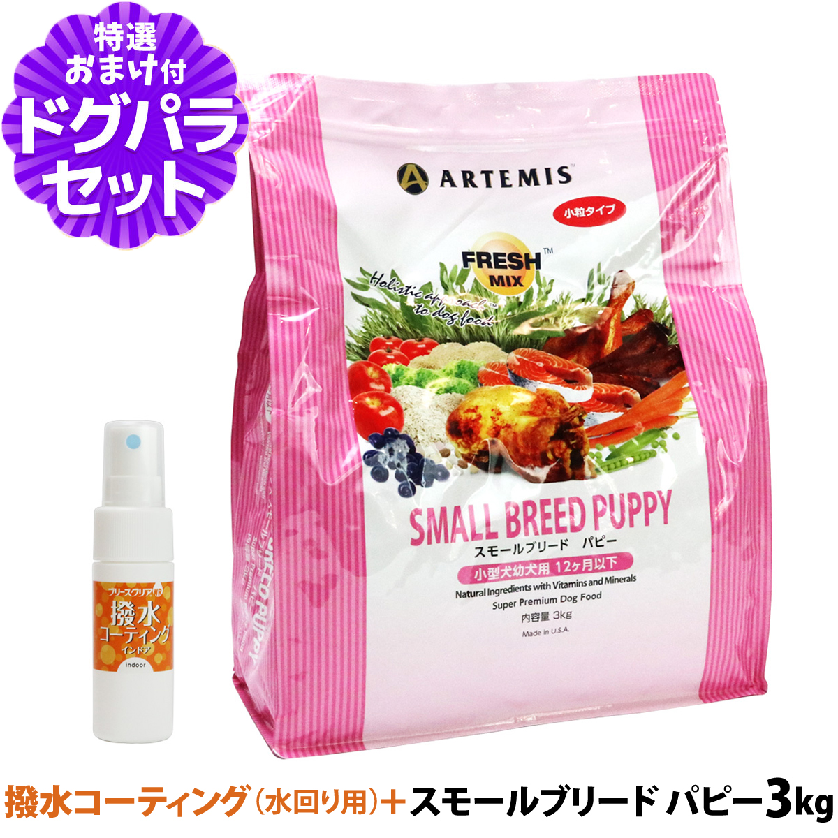 アーテミス フレッシュミックス スモールブリード パピー 3kg+撥水コーティングインドア(水回り用) 20mlアーテミス フレッシュミックスの解説アーテミスは世界25か国以上で愛犬家たちに愛されているアメリカ生まれの最高品質プレミアムドッグフード。時間と手間をかけて行なう独自の加工方法で新鮮さにこだわり、素材が持つ栄養とおいしさを最大限に活かしました。フレッシュミックス スモールブリードパピーの詳細対象小型犬・幼犬用、離乳期〜12ヶ月以下スモールブリードパピーについて・育ち盛りの仔犬やその母犬の為、良質なタンパク質・脂肪分が含まれています。・私たち人間が口にできるレベルの食材使用・複数の動物性タンパク質をベストバランスで配合・必要な栄養素をあますことなく網羅・様々な抗酸化物質の働き・ペットにとって有害な物質は完全除去・栄養成分の吸収効率をあげる独自の製法・アレルギーに配慮し、小麦・大豆・とうもろこしは不使用 ¥6,600 |