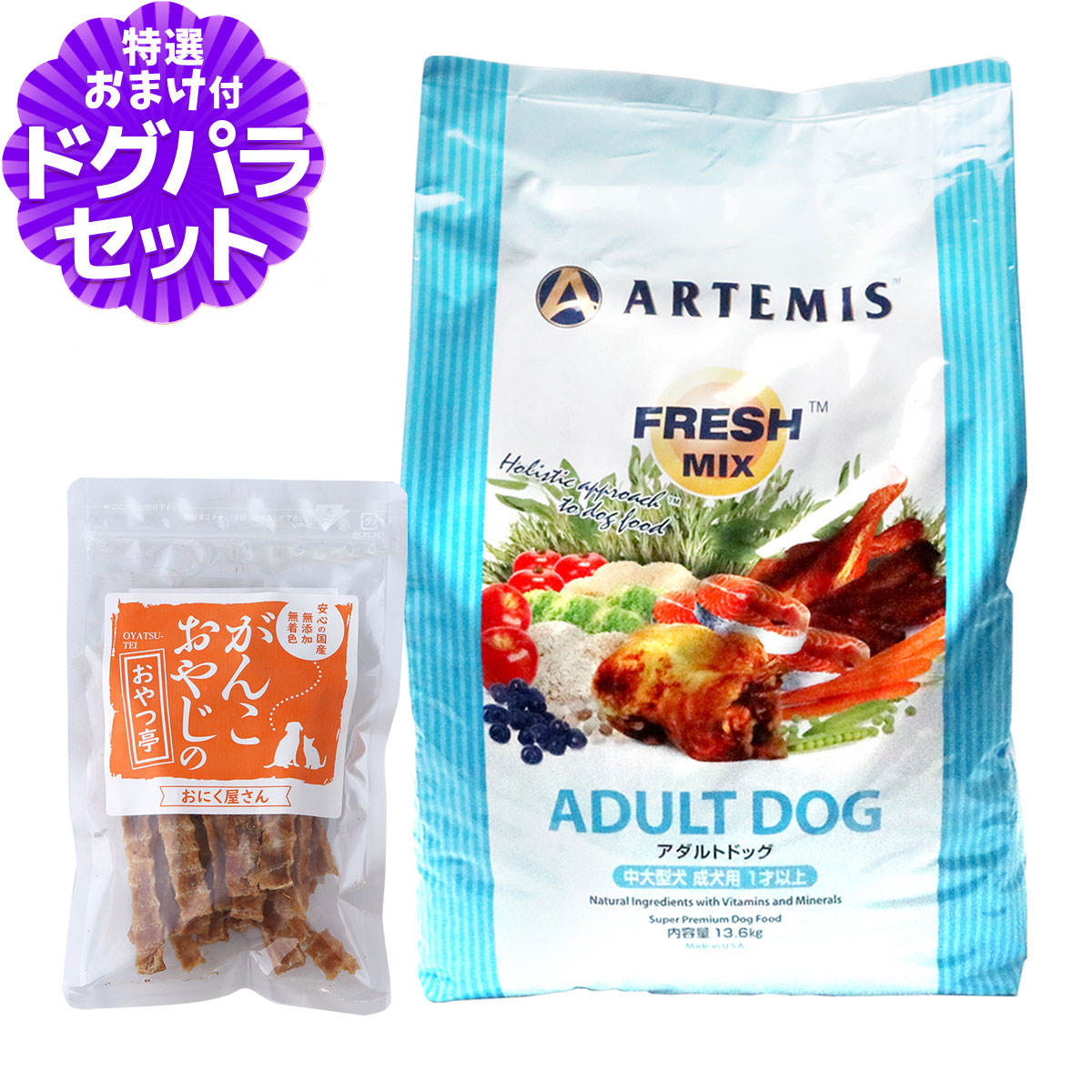 (選べるプレゼント付き)アーテミス フレッシュミックス アダルト ドッグ 13.6kg ドッグフード 成犬 中型犬 大型犬アーテミス フレッシュミックスの解説アーテミスは世界25か国以上で愛犬家たちに愛されているアメリカ生まれの最高品質プレミアムドッグフード。時間と手間をかけて行なう独自の加工方法で新鮮さにこだわり、素材が持つ栄養とおいしさを最大限に活かしました。フレッシュミックス アダルトドッグの詳細対象中・大型成犬用 1才以上用アダルトドッグについて・私たち人間が口にできるレベルの食材使用・複数の動物性タンパク質をベストバランスで配合・必要な栄養素をあますことなく網羅・様々な抗酸化物質の働き・ペットにとって有害な物質は完全除去・栄養成分の吸収効率をあげる独自の製法・アレルギーに配慮し、小麦・大豆・とうもろこしは不使用・DHA・EPAを含むサーモンオイルを使用 ¥18,920 |