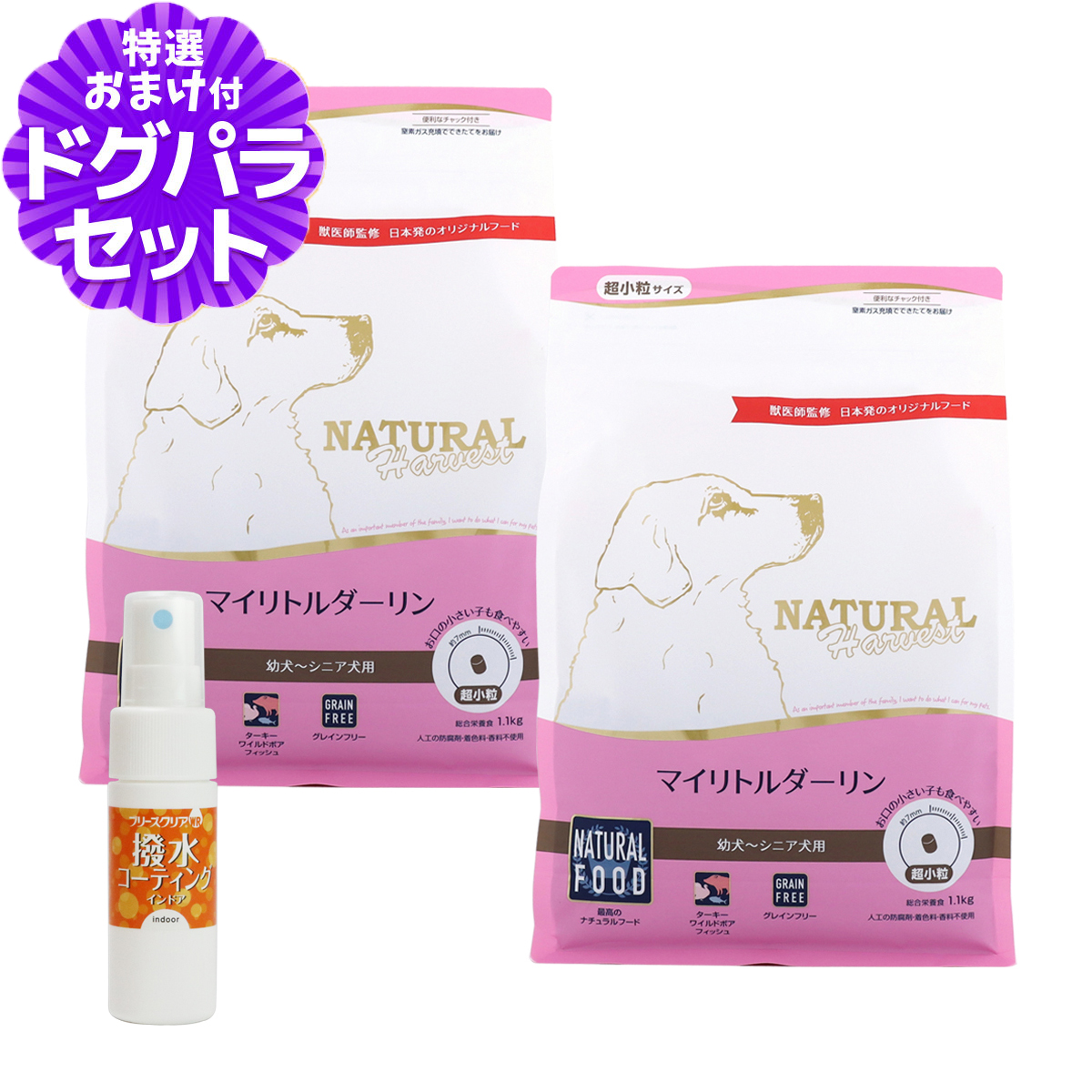 (順次パッケージ変更)ナチュラルハーベスト マイリトルダーリン 1.1kg×2袋+撥水コーティングインドア(水回り用) 20mlナチュラルハーベストの解説ナチュラルハーベストは、日本特有の気候や環境を考えて、日本に住む犬の為に設計された日本発オリジナルドッグフード。遺伝子組み換え作物を使用せず、アレルギーになりにくいとされる肉類をできるだけ主要たんぱく質にするなど、栄養学に基づいて原材料を取り入れているプレミアムドッグフードです。ナチュラルハーベスト マイリトルダーリン の詳細対象幼犬・成犬・シニア犬用ナチュラルハーベスト プライムフォーミュラ マイリトルダーリン について■最高のナチュラルフード栄養バランスは本来、様々な食材を組み合わせることで整います。微量なビタミンやミネラルも出来る限り添加せず、食材のもつ栄養素で作り上げた総合栄養食です。■ターキー・ワイルドボア・フィッシュ動物系のワイルドボア(イノシシ)とポーク、家禽系のターキーとチキン、魚系のメンハーデン、種類の異なるたんぱく質を組み合わせることでアミノ酸バランスの向上と飽きのこないおいしさに。■グレインフリー様々な炭水化物の中でも消化性の高いポテトを採用しました。穀類の消化が苦手な子に配慮したグレインフリーフードです。 ¥7,920 |