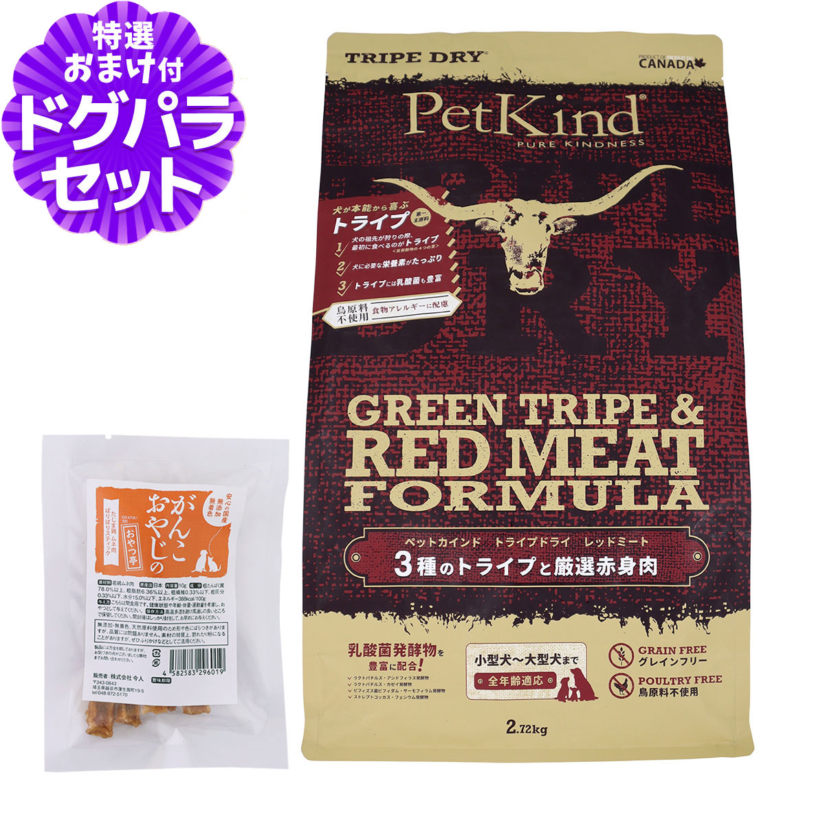 ペットカインド トライプドライ ドッグフード トライプ&レッドミート 2.72kg+国産たじま鶏ジャーキー(小サイズ)ビーフ、ラム、そしてベニソンと3種ものグリーントライプを主原料に採用。 鳥原料を使わず、原料には名前の通り「赤身肉」部分のみを厳選採用。まさに究極のトライプドライです。 ・つやつやな被毛、健康的な筋肉や体型作りに! ・腸の健康を維持し、元気なお腹へ! ・食い飽き・食いムラ・ご飯を食べないお悩みを解消。 ・「一番食べたい部位」だから喜んで食べてくれる高嗜好性。 ・グリーントライプにはアミノ酸や必須脂肪酸が豊富、第一胃から第四胃まですべてを原料に採用。 ・遺伝子組み換えや農薬、残留化学物質のない「新鮮で安全な食材」を使用。 ・合成保存料や人工香料・着色料は一切使用していません。 ・安心のカナダメイド。 ・丈夫な体づくりのために、子犬のころからグリーントライプを与えることをおすすめします。 犬/ドッグ/ドック/フード/グレインフリー/穀物不使用/鳥原料不使用/牛/うし/羊/鹿/オメガ3/オメガ6/ペット/PetKind/TripeDry ¥7,040 |