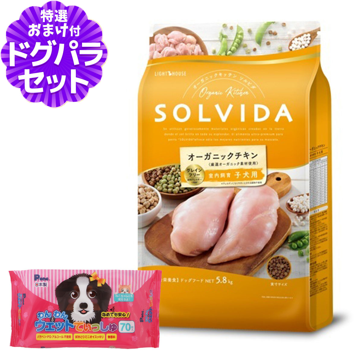ソルビダ ドッグフード グレインフリー チキン 室内飼育子犬用 5.8kg+わんわんウエットてぃっしゅ 1個ソルビダ グレインフリーチキン 室内飼育子犬用の詳細対象 室内飼育子犬用、妊娠中・授乳中の母犬用育ち盛りの成長期の子犬と、高いエネルギーを要求される妊娠中・授乳中の母犬のために、良質なたんぱく質であるオーガニックチキンを贅沢に使用し、成長に必要な栄養をバランスよく配合したレシピです。さらにアレルギーに配慮し、穀物類は一切使用しておりませんので、腸に負担をかけることなく消化ができます。また、ユッカシジゲラ抽出物を配合することで、体臭や便臭の軽減をサポートします。 その他直射日光を避け、風通しの良い場所に保管してください。※当店の商品は全て正規品です。安心してお買い求めください。■パッケージ・内容成分などは予告なく変更になることがございます。ご了承くださいませ。 ソルビダ/インドア/室内犬/パピー/子犬用/母犬用/チキン/グレインフリー/ドッグフード ¥15,367 |