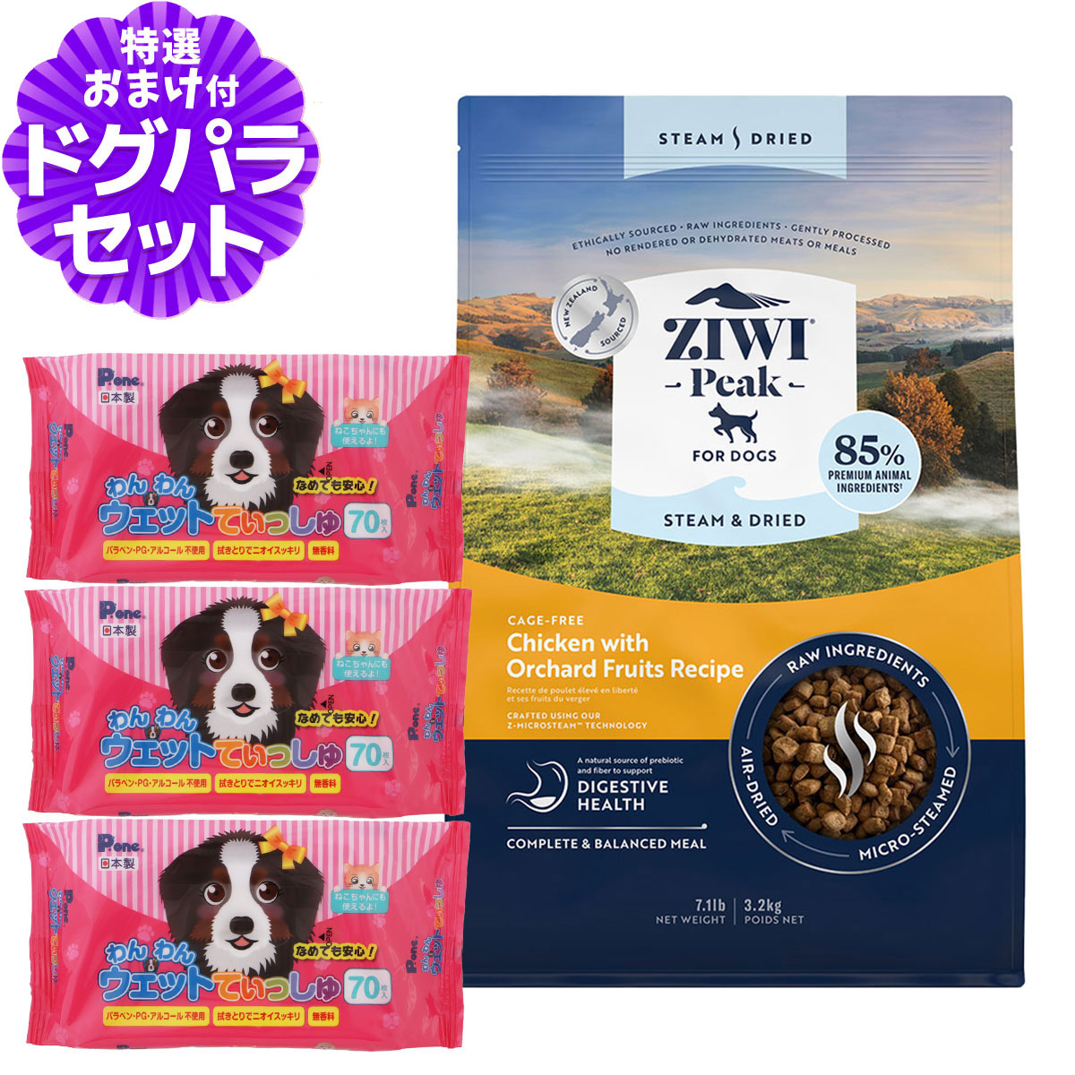 ZiwiPeak ジウィピーク スチーム&ドライ・ドッグフード ケージフリーチキン with オーチャードフルーツレシピ 3.2kg+わんわんウエットてぃっしゅ 3個対象全犬種・全年齢用ケージフリーチキン with オーチャードフルーツ レシピについて・ニュージーランドの緑豊かな牧草地で倫理的な方法で調達されたチキン生肉と、消化器官の健康維持をサポートするオーチャードフルーツとチコリルートを使用して作られています。・サクサク食感のおいしい一口サイズ。・乾燥肉やレンダリング肉は一切使用していません。・消化器官の健康維持をサポートするプレバイオティクスと繊維を配合しています。その他■パッケージ・内容成分などは予告なく変更になることがございます。ご了承くださいませ。※当店の商品は全て正規品です。安心してお買い求めください。リン/カルシウム/オメガ3脂肪酸/グルコサミン/コンドロイチン/イヌリン/犬/ドッグフード/ドライフード/鶏/子犬/パピー/成犬/シニア/高齢犬 ¥24,310 |