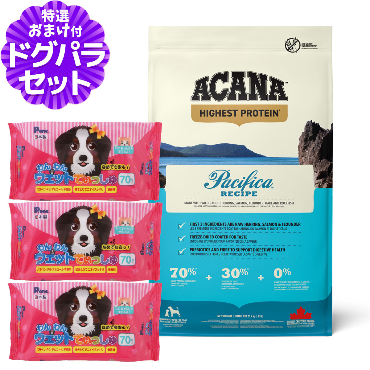 アカナ パシフィカドッグ 11.4kg+わんわんウエットてぃっしゅ 3個アカナ パシフィカドッグレシピについて・魚肉を主原料とした穀類一切不使用のドッグフードです。・あらゆる犬種・年齢に対応しています(オールステージ)。 ・水を加えず原材料の水分のみでスチームにて低温調理されています。・魚原料を70%、野菜・フルーツなどの植物原料を30%使用しています。・最高品質のサーモン・ニシン・カレイを新鮮なまま(無冷凍・保存料不使用)調理しています。・天然の海水魚は栄養豊かなたんぱく質、DHAとEPAを豊富に含んでいます。・オメガ3必須脂肪酸(EPAとDHA)は免疫と輝く皮膚と毛並み作りをサポート。・野菜、フルーツは低GIを維持し、必須微量元素と植物栄養素を豊富に供給します。適応犬種・年齢等全犬種・全年齢対応、穀類・鶏肉アレルギーが気になる愛犬にもおすすめ原産国カナダアカナ グレインフリー 穀物不使用 ドッグフード 低アレルゲン 低炭水化物 ペット フード おすすめ ドックフード ドライ 犬 ¥22,770 |
