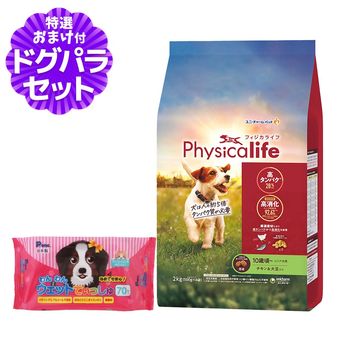 [パッケージ変更済]フィジカライフ Physicalife シニア犬用 チキン&大豆入り 2kg+わんわんウエットてぃっしゅ1個Physicalife ドッグフードの解説シニア犬の全身の筋肉の健康を維持し、丈夫な足腰をサポートするドライタイプの総合栄養食シニア期の全身の重要な筋肉の健康を維持するために、厳選素材の鶏肉・魚・大豆由来タンパク質をバランスよく豊富に含み、胃で崩れやすい粒により、92.6%と高いタンパク質消化率を実現(特許取得)。丈夫な足腰の健康を維持し、よく食べてよく遊ぶ楽しい毎日が続きます。・全身の重要な筋肉の健康を維持するために、厳選素材の鶏肉・魚・大豆由来のタンパク質をバランスよく豊富に含み、分離大豆タンパクを独自のバランスで配合した粒により、高いタンパク質消化率※1を実現(特許取得)しました。・筋肉の発育に重要な子犬期から、足腰を維持したいシニア期まで、生涯にわたって健康なカラダづくりをサポートするラインナップで展開します。※1:分析値代表例 愛犬元気全成長段階用比 子犬用:約130% 成犬用:約105% シニア犬用約110% ユニ・チャーム調べ対象 シニア犬用 10歳頃〜Physicalife/フィジカライフ/ユニ・チャーム/ユニチャーム/チキン/大豆/シニア犬/総合栄養食 ¥4,807 |