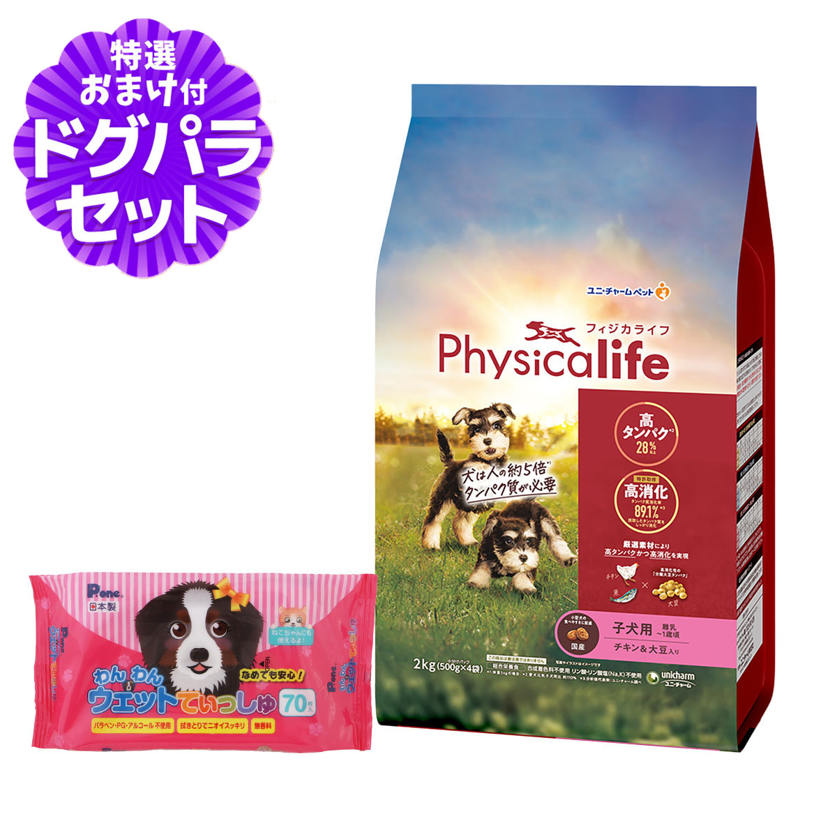 [パッケージ変更済]フィジカライフ Physicalife 子犬用 チキン&大豆入り 2kg+わんわんウエットてぃっしゅ1個Physicalife ドッグフードの解説子犬期の筋肉の発育に配慮し、丈夫で健康なカラダづくりをサポートするドライタイプの総合栄養食子犬期の全身の重要な健康な筋肉を維持するために、厳選素材の鶏肉・魚・大豆由来のタンパク質をバランスよく豊富に含み、胃で崩れやすい粒により、89.1%と高いタンパク質消化率を実現(特許取得)。丈夫で健康な身体つくりをサポートし、よく食べてよく遊ぶ楽しい毎日が続きます。・全身の重要な筋肉の健康を維持するために、厳選素材の鶏肉・魚・大豆由来のタンパク質をバランスよく豊富に含み、分離大豆タンパクを独自のバランスで配合した粒により、高いタンパク質消化率※1を実現(特許取得)しました。・筋肉の発育に重要な子犬期から、足腰を維持したいシニア期まで、生涯にわたって健康なカラダづくりをサポートするラインナップで展開します。※1:分析値代表例 愛犬元気全成長段階用比 子犬用:約130% 成犬用:約105% シニア犬用約110% ユニ・チャーム調べ対象 子犬用 離乳〜1歳頃用Physicalife/フィジカライフ/ユニ・チャーム/ユニチャーム/チキン/大豆/子犬/パピー ¥4,807 |