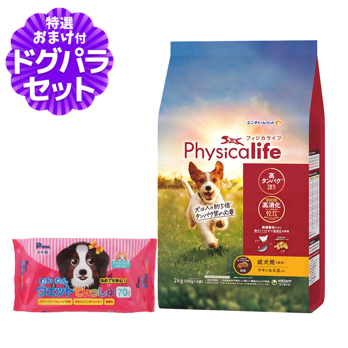 [パッケージ変更済]フィジカライフ Physicalife 成犬用 チキン&大豆入り 2kg+わんわんウエットてぃっしゅ1個Physicalife ドッグフードの解説成犬期の全身の筋肉の健康を維持し、健康で太りにくいカラダづくりをサポートするドライタイプの総合栄養食成犬期の全身の重要な健康な筋肉を維持するために、厳選素材の鶏肉・魚・大豆由来のタンパク質をバランスよく豊富に含み、胃で崩れやすい粒により、92.1%と高いタンパク質消化率を実現(特許取得)。丈夫で健康な身体つくりをサポートし、よく食べてよく遊ぶ楽しい毎日が続きます。・全身の重要な筋肉の健康を維持するために、厳選素材の鶏肉・魚・大豆由来のタンパク質をバランスよく豊富に含み、分離大豆タンパクを独自のバランスで配合した粒により、高いタンパク質消化率※1を実現(特許取得)しました。・筋肉の発育に重要な子犬期から、足腰を維持したいシニア期まで、生涯にわたって健康なカラダづくりをサポートするラインナップで展開します。※1:分析値代表例 愛犬元気全成長段階用比 子犬用:約130% 成犬用:約105% シニア犬用約110% ユニ・チャーム調べ対象 成犬用 1歳頃〜Physicalife/フィジカライフ/ユニ・チャーム/ユニチャーム/チキン/大豆/成犬/総合栄養食 ¥4,620 |