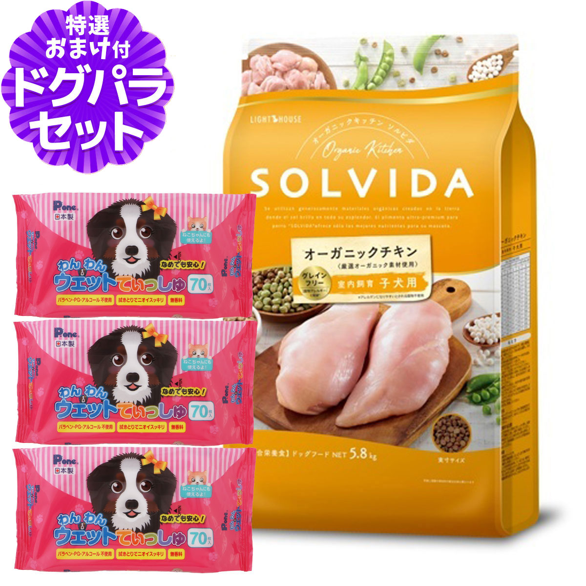 ソルビダ グレインフリー チキン 室内飼育子犬用 5.8kg+わんわんウエットてぃっしゅ 3個ソルビダ グレインフリーチキン 室内飼育子犬用の詳細対象 室内飼育子犬用、妊娠中・授乳中の母犬用育ち盛りの成長期の子犬と、高いエネルギーを要求される妊娠中・授乳中の母犬のために、良質なたんぱく質であるオーガニックチキンを贅沢に使用し、成長に必要な栄養をバランスよく配合したレシピです。さらにアレルギーに配慮し、穀物類は一切使用しておりませんので、腸に負担をかけることなく消化ができます。また、ユッカシジゲラ抽出物を配合することで、体臭や便臭の軽減をサポートします。 その他直射日光を避け、風通しの良い場所に保管してください。※当店の商品は全て正規品です。安心してお買い求めください。■パッケージ・内容成分などは予告なく変更になることがございます。ご了承くださいませ。 ソルビダ/インドア/室内犬/パピー/子犬用/母犬用/チキン/グレインフリー/ドッグフード ¥15,367 |