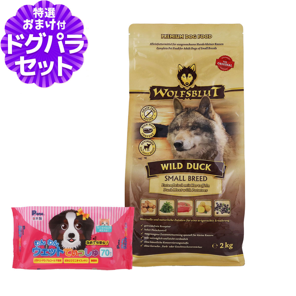 (在庫限りで販売終了)ウルフブラット スモールブリード ワイルド ダック(ダックとポテト) 2kg+わんわんウエットてぃっしゅ1個ウルフブラット スモールブリード ワイルドダック ダックとポテトの詳細対象成犬用 スモールブリード ワイルドダック ダックとポテトについて・オオカミの自然食をモデルにしたドッグフード。・天然素材を使ったレシピ。・主原料は、新鮮で消化のよいカモ肉。・カモ肉には、ビタミンB1、B2、B6、B12、ナイアシンなどの貴重なビタミンB群や、鉄、亜鉛などのミネラルが含まれています。・穀類は、犬にとってアレルギーの原因となりやすい食材であり、オオカミの自然食には含まれていないため、使用していません。・スイートポテト、エルダーベリー、アロニアベリー、タンポポ、キクイモ、高麗人参などの貴重なスーパーフードを配合。・キクイモ由来の天然プレバイオティクス効果。・トウモロコシ、グルテン、大豆、香料、人工添加物不使用。(必須ビタミン・ミネラルを除く)・ご飯時間が待ち遠しい!定番の味。・獣医師と一緒に開発。・動物実験なし。 ¥6,072 |